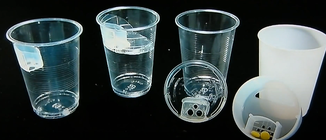 兵庫県に住む発明者、岸本豊彦さんのアイデア商品です。ご両親の介護を体験から、錠剤服用のコップを開発しました。