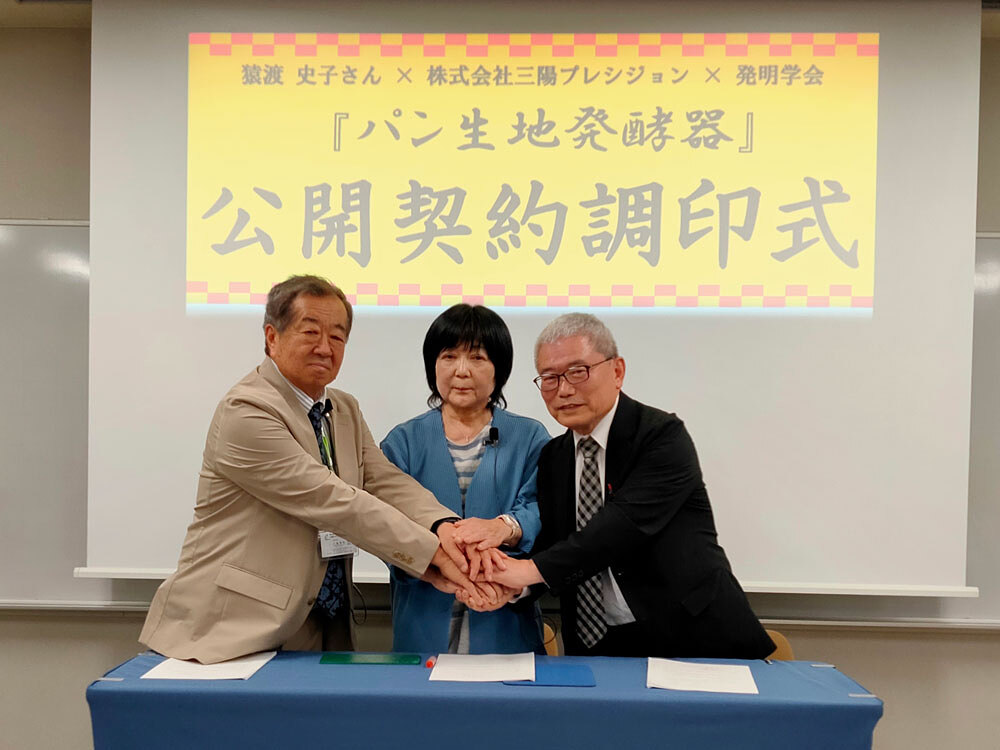 昨年7月に、「発明発表オーディション」で、発表した発明品『パン生地の発酵器』が、企業審査員として当日参加されていた、株式会社三陽プレシジョンの小島社長の目に留まり、商品化検討のオファーを受け、今回契約になりました。