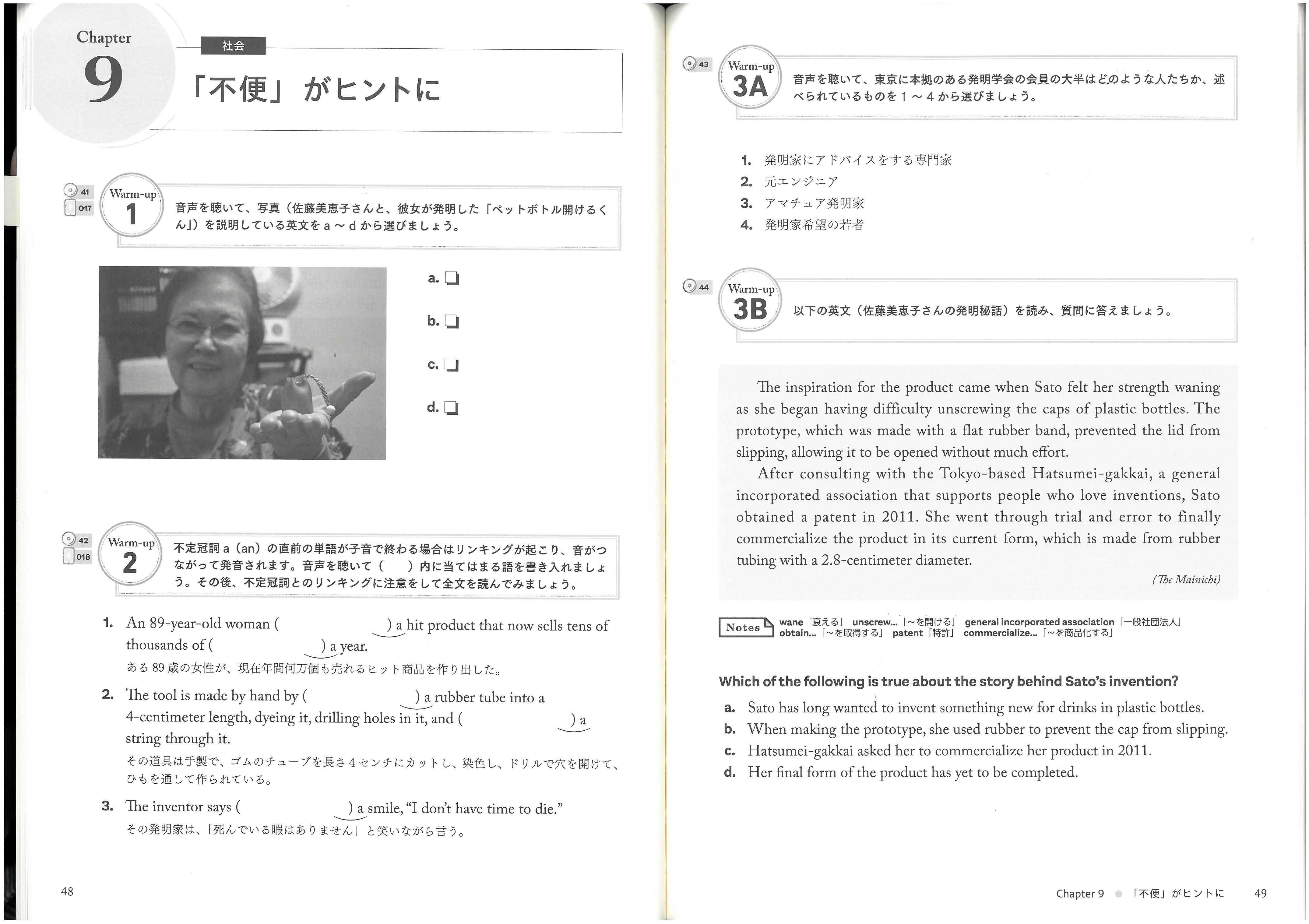 この記事を目にした英語教科書の編集部から、「不便がヒントに」というエピソードで佐藤さんの発明が教科書に取り上げたいというオファーがあったのです。驚いたことに、教科書には「死んでる暇がない」と笑いながら語る佐藤さんのエピソードがしっかりと設問になっていました。