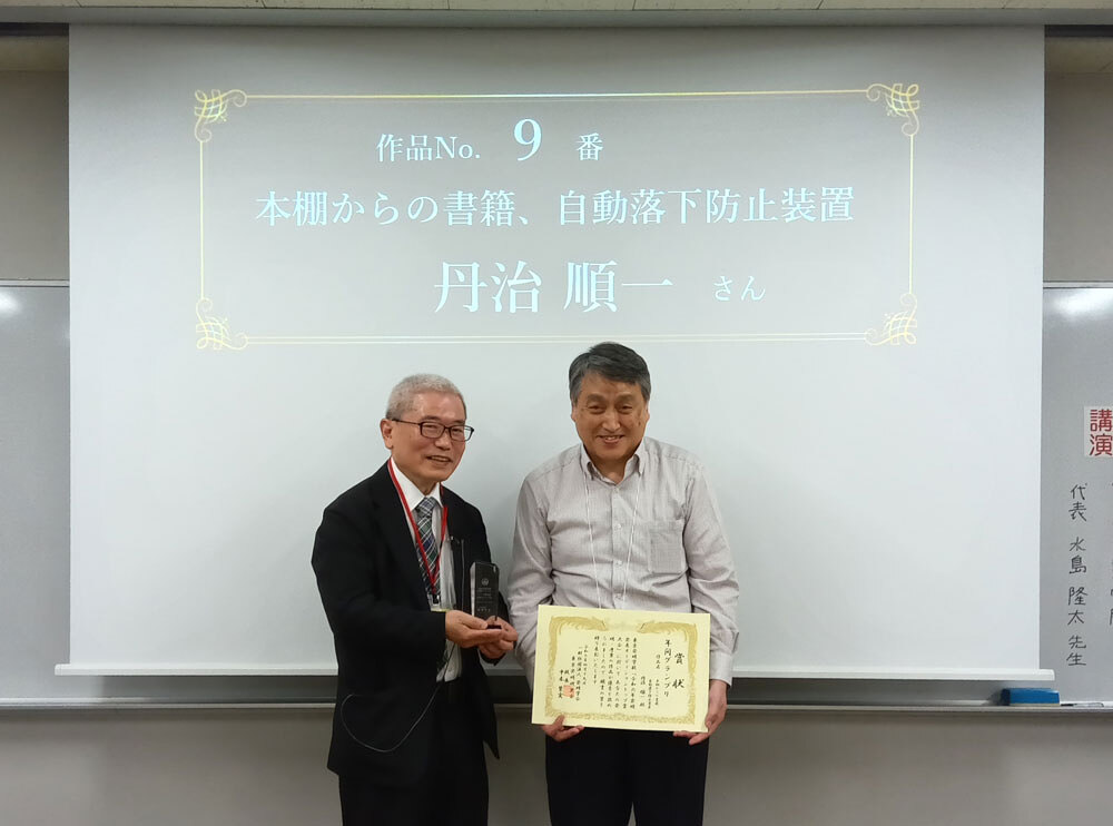 投票の結果、2024年のグランプリ作品に選ばれたのは、福島県からご参加の丹治 順一 さんによる発明品「本棚からの書籍自動落下防止装置」でした。前回より格段にわかりやすくなった発表内容が、とても印象的でした。