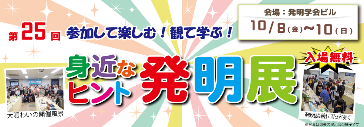 「第25回 身近なヒント発明展」に多数のご応募をいただきまして、誠にありがとうございました。 応募作品の中から1次審査を合格した112点が10月8~10日に開催された展示会に勢ぞろいしました。 会期中の一般投票と企業審査を参考に、厳正なる審査を行いました結果、 発明学会大賞、特別賞、優良賞の計16作品が選ばれましたのでお知らせいたします。