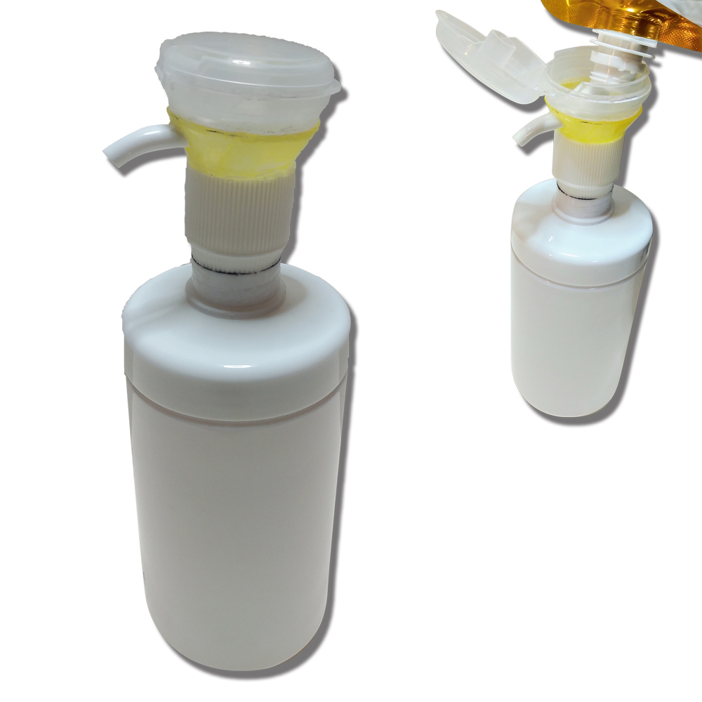 ポンプの押す部分が開閉式の蓋になっていて、そこへ注ぐことで、ボトル内部に補充される仕組みとなっている。蓋の部分が大きいため、注ぎ入れやすくなる。ノズルを抜かずに補充ができる。