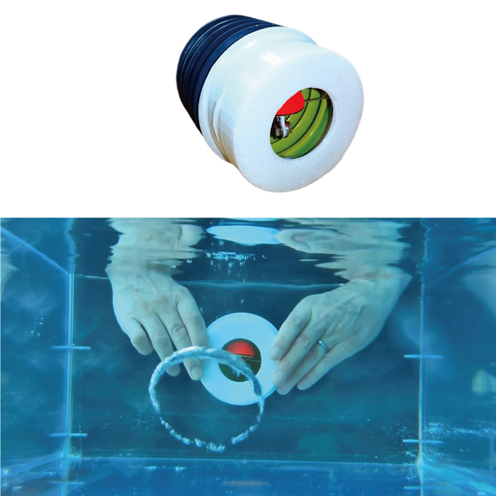 水中で口から吐き出し、ドーナッツ型のバブルリングを簡単に作れる遊具。ポンプ機能の本体の内部に、空気溜まりを作る浮子が架設されている。水中で本体を押すと、誰でも簡単にバブルリングが発射できる。