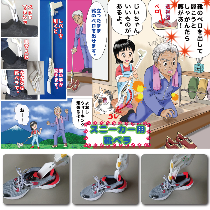 立ったままスニーカーを履くことができるスニーカー専用靴ベラ。手元のトリガーを引くことで、先端が開閉し靴のベロを挟んで引き上げられる。足を入れた後、靴ベラとしても使用可能。