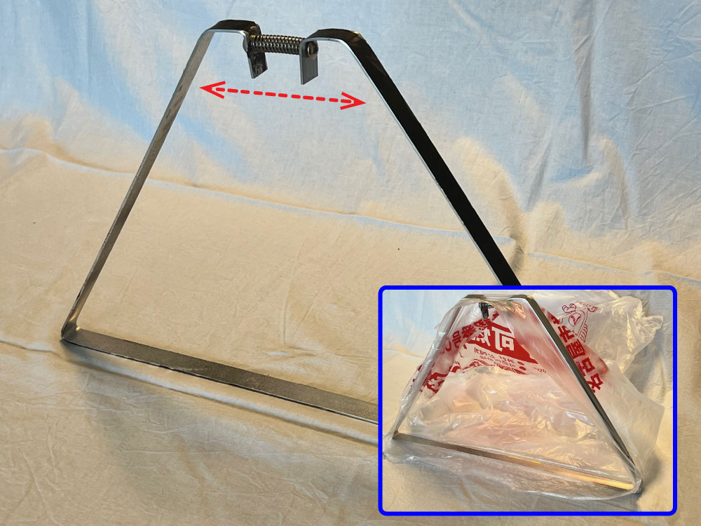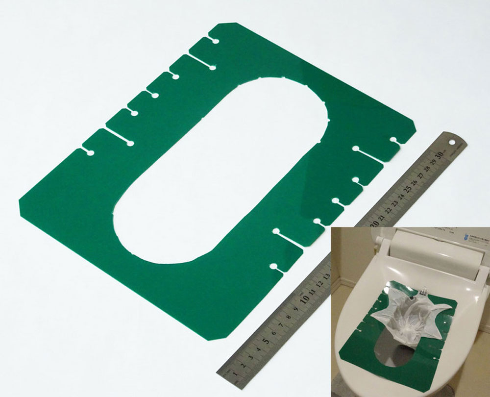 矩形状のプラスチックシートの中央に穴を設け、外周の長辺にスリットを配置。穴にレジ袋を通し、持ち手部分をスリットに固定して使用。災害時に自宅トイレで快適かつ衛生的に利用可能。