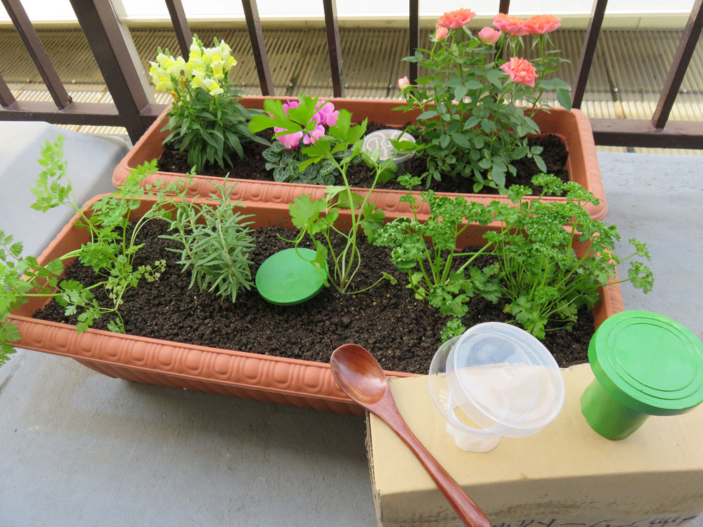 大きな受け口と連結した筒体からなる漏斗型の肥料注入器。プランターに穴を掘り、本品を差し入れ、受け口から肥料を入れる。数カ月すると肥料が減るので、継ぎ足して使用する。