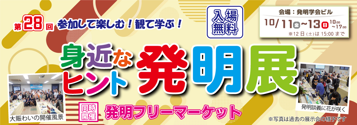 「第28回 身近なヒント発明展」に多数のご応募をいただきまして、誠にありがとうございました。 応募作品の中から1次審査を合格した100点が10月11~13日に開催された展示会に勢ぞろいしました。 会期中の一般投票と企業審査を参考に、厳正なる審査を行いました結果、 発明学会大賞、特別賞、優良賞の計16作品が選ばれましたのでお知らせいたします。