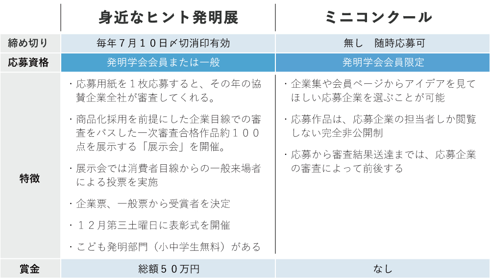 - A:一般の方でもご応募いただける、「身近なヒント発明展」と、当会会員だけが応募できる「ミニコンクール」がございます。