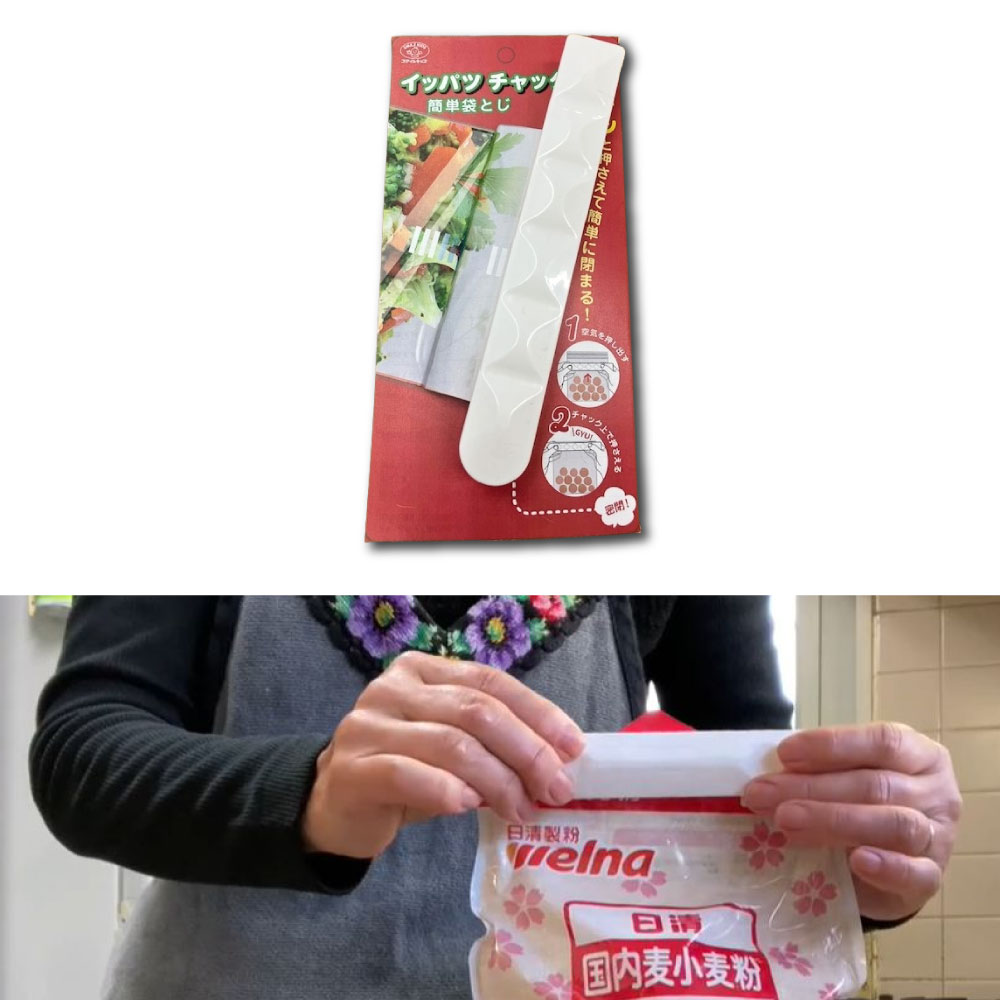 普通のパスタメジャーは、使わないときは邪魔モノ扱いです。この発明は、パスタの袋を閉じて、留めておくクリップに使います。