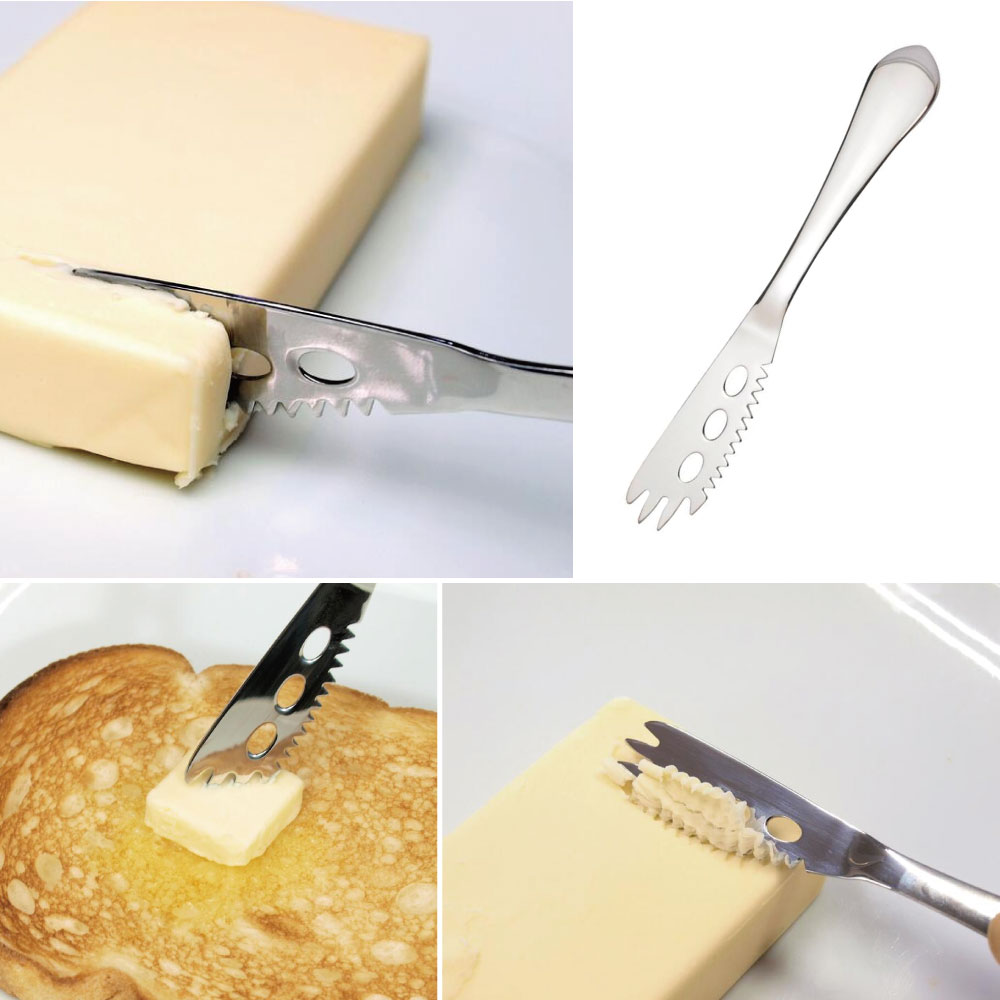 あるとき、バターナイフが食卓に無く、周りを見渡したとき、デザート用のフォークが目に入りました。そのフォークをバターの塊にグサッと突き刺し、食パンに擦りつけてみました。すると、バターは転がらずにスムーズに食パンに塗れたのです。小川さんはこれに注目し、試作品づくりに着手しました。