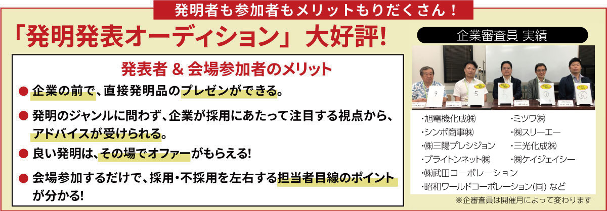 なお、発表作品と、企業審査員が求める発明ジャンルとのマッチングがうまくいった場合、「商品化検討」のオファーがある場合がございます。