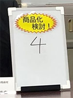 講評の際、企業審査員が投票をした作品を提示したホワイトボードに貼られる、「商品化検討」の黄色い札が、その表示となります。その場合、会終了後、名刺交換をして今後の打ち合わせをしてください。