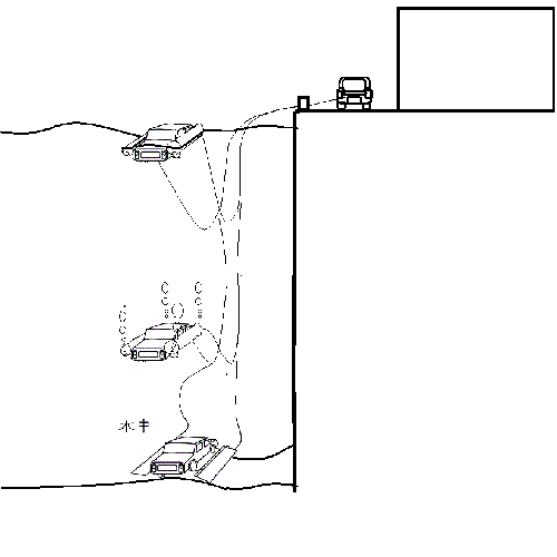 自動車などの重量物が川や海に入水し沈むと、人力で引き上げることが出来ないので、少ない人数でも水中で設置し、水中で浮上袋を膨らませて重量物を浮上させる浮上袋システムを提供する。 | ||
