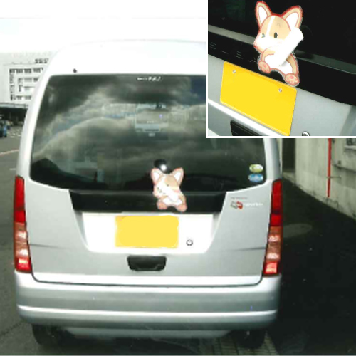 車両を運転中に、進路を譲ってもらった時に後続車に対し、感謝の気持ちを表現することを目的とし、リアワイパーの軸を利用し、犬の尾の形をした飾りの装飾パネルを取り付けた。尾は左右にシッポをふる様になり、後続車の運転手の反応がけっこう面白いです。 | ||