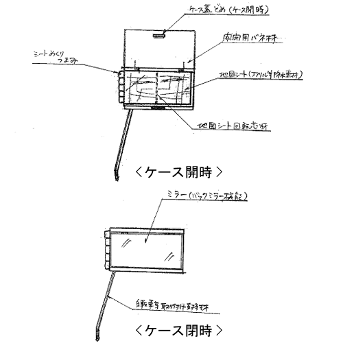 バックミラーをケース状にし、ケース内にアクリル等の材質の防水性地図シートを内蔵させ、シートに装着した摘みを操ることによって、信号待機中等に経路確認を実施するといった、自動二輪・原付・自転車等用のバックミラーを提案する。開閉はバネ開閉とする。 | ||