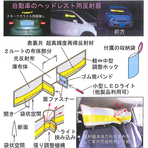 稀に起こる電気の減衰が心配な夜間路上での非常時に、パラシュートのようにパッと広げて左右のヘッドレストに被せて使用する2次防災用の再帰反射リフレクターです。反射器本体の形状を利用して、車内間接照明が可能です。携帯性に優れ、贈答品にも最適です。 | ||